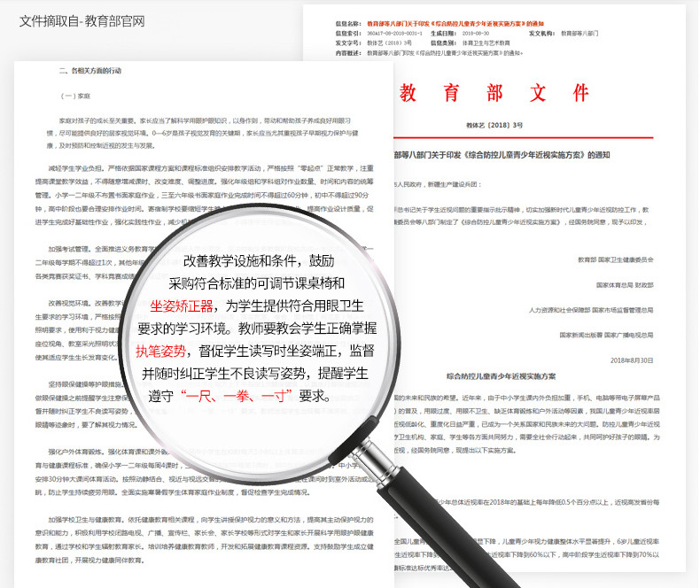 ▌肖总为李湘老师介绍猫太子产品 2018年8月,国家教育部发布了红头文件,在教育部等八部门关于印发《综合防控儿童青少年近视实施方案》的通知里明确表示,要求学校改善教学设施和条件,鼓励采购符合标准的可调节课桌椅和坐姿矫正器,为学生提供符合用眼卫生要求的学习环境,教师要教会学生正确掌握执笔姿势,督促学生读写时坐姿端正,监督并随时纠正学生不良读写姿势,提醒学生遵守“一尺、一拳、一寸”要求。