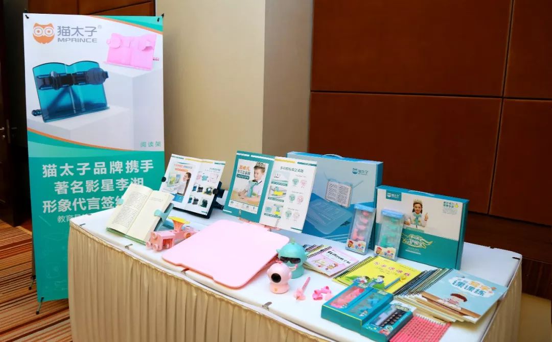 ▌猫太子代言人签约现场 签约现场,猫太子系列产品齐齐登场,坐姿矫正器、阅读架、握笔器、凹槽字帖、削笔机书立笔袋等整齐陈列,散发着活力与健康。